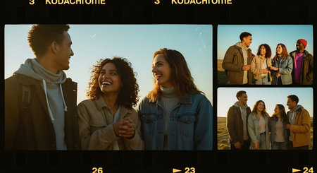 A collage of four photos featuring a diverse group of friends smiling and enjoying outdoor activities, dressed in casual, colorful clothing.