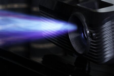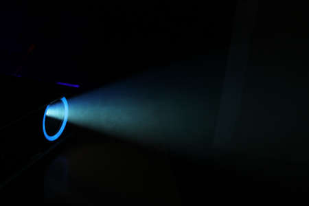 A modern projector emits a bright light beam in a dark setting, showcasing its functionality for presentations, movies, and visual displays in various environments.