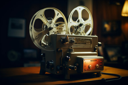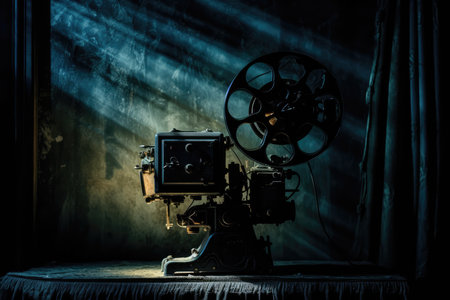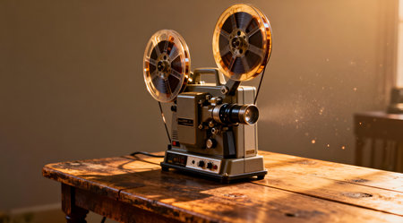 This illustration showcases a nostalgic and artistic approach with a focus on vintage aesthetics and warm lighting. Ideal for use in film festivals, retro-themed events, or educational materials about cinema history. The soft studio lighting enhances the mood, making it perfect for creative projects in the entertainment industry. AI-generated illustration.