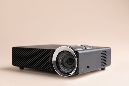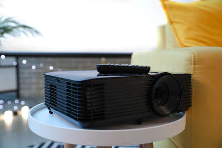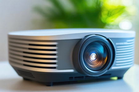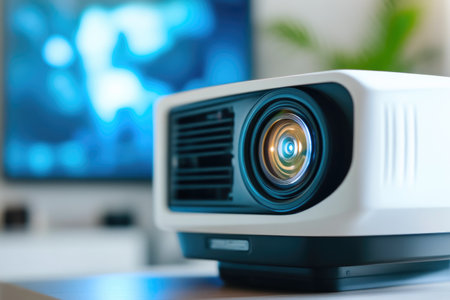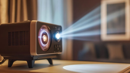 A modern home projector is positioned on a sleek table, casting a bright light in a cozy living room ambiance, perfect for entertainment and relaxation.