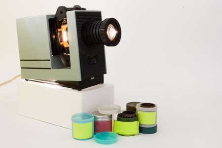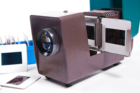 Close up view of vintage filmstrip projector on the white background. Old projector for displaying of slides.