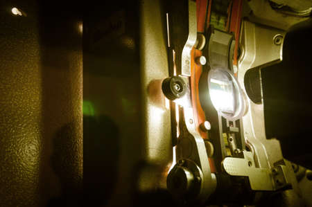 Film projector working in dark and light beam. Real 35mm cinema projection with copy space