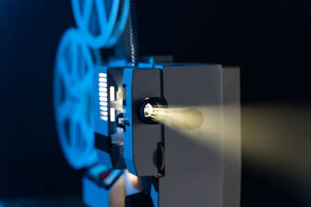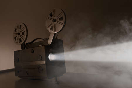 Vintage old fashioned projector in a dark room projecting a film, cinematography concept