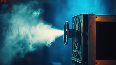 A vintage film projector casts a soft light in a darkened room, surrounded by a smoky atmosphere, evoking feelings of nostalgia and the artistic essence of classic cinema.
