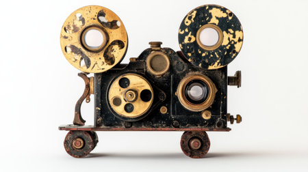 This image features a vintage film projector with intricate brass mechanics and film reels, ideal for showcasing classic cinematic art.