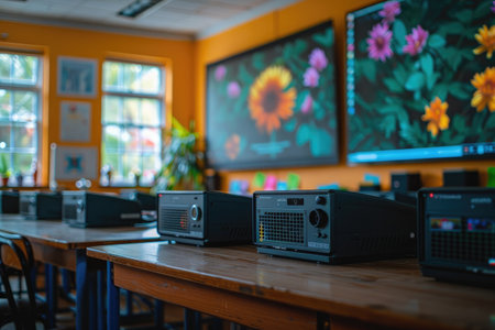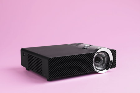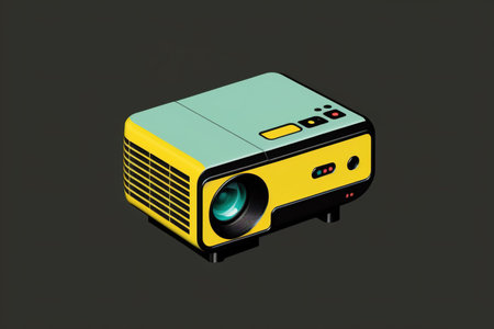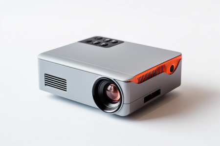 A sleek modern projector rests on a table, featuring a glowing lens and vibrant lighting. Ideal for showcasing technology and design in cinematic settings.