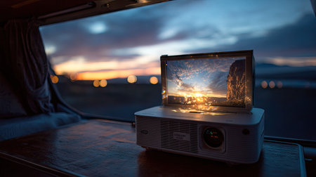 Compact projector with built-in speakers projecting a movie onto a campervan wall