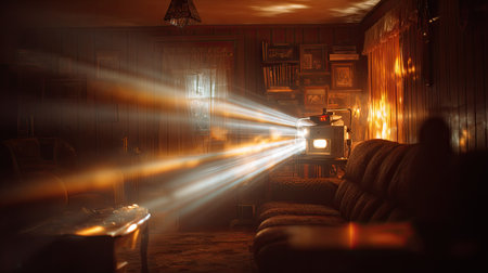Movie projector lens flaring as a film begins in a cozy, dimly lit living room
