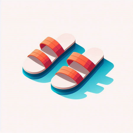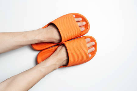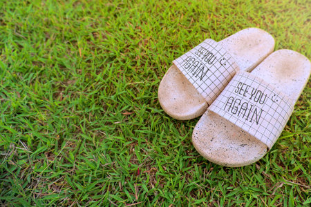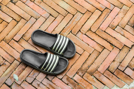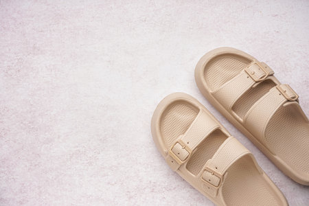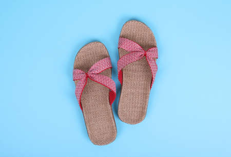Pair of flip flops shoes on the flat lay floor background with copy space.