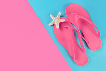 Pink sandal flip flops and starfish on blue and pink abstract pastel background. Empty side for text and copy space. Summer vacation concept. Top view