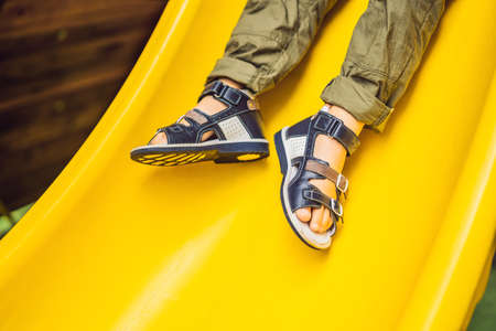Bare feet of boy in black slippers with hairy legs in your back yard