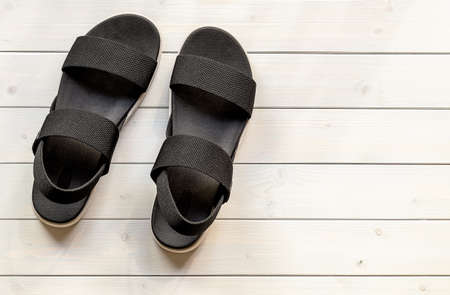 Women's casual platform open-toe black sandals from eco recycled plastic fibers on the white wooden background. Zero waste clothes concept. Summer shoes.