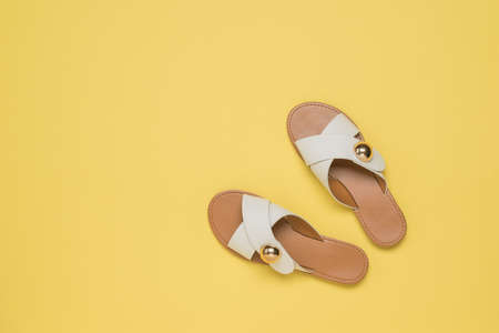 Top view of yellow leather sandals on a yellow background. Comfortable summer women's shoes.