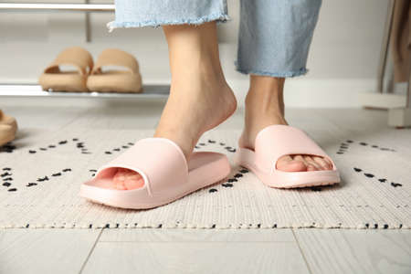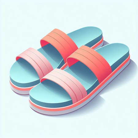 Bright pink slippers are on the pebble beach. Summer walk, sea tourism and travel. Flip-flops
