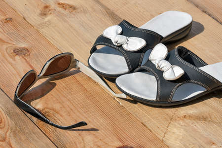 Pair of yellow children's slippers in the form of winking ducks on the wooden floor of the bathhouse close-up.