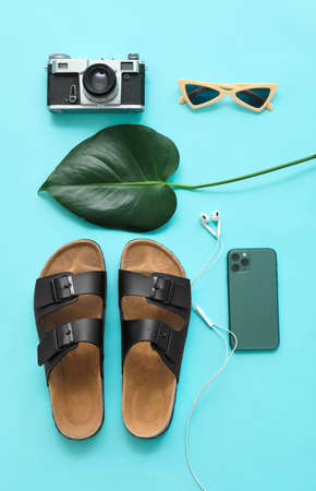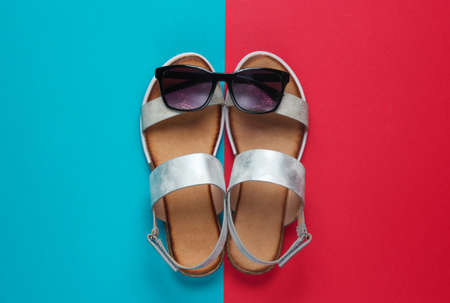 Creative summer beach flat lay. Leather women's sandals, sunglasses on blue red background. Top view