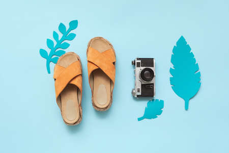 Women's purple flip-flops on a blue background with green leaves. The concept of summer women's shoes.
