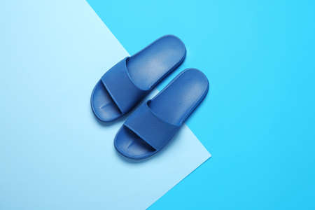 Top view of white and blue color rubber slipper shoes on blue wooden background with copy space. Summer holiday vacation concept.