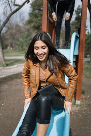 Pretty girl going down on a slide in park