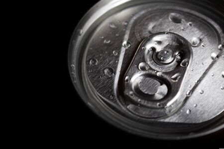 aluminum soda and beer beverage can with water droplets isolated on dark background, metal can, recyclable product
