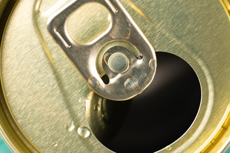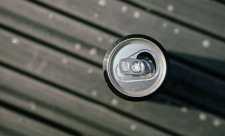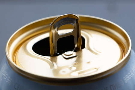 Opened can of beer or soda water with golden coloured aluminium top. Close-up view from high angle with copy space