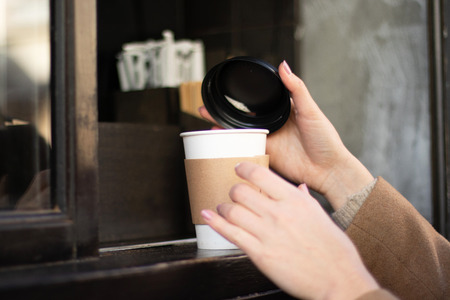 Buying coffee in an outdoor cafe. The hand of the girl takes a paper cup with a drink tea, coffee, cocoa .