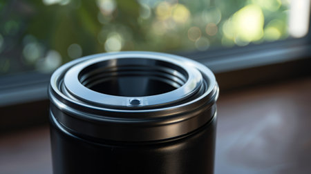 A sleek steel travel mug sits in a car cup holder, illuminated by soft sunlight, surrounded by a tranquil natural backdrop, perfect for daily commuters.