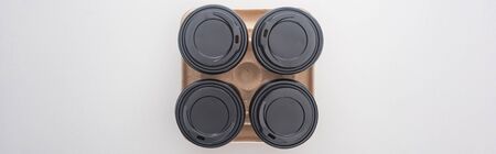 panoramic shot of paper cups with coffee in cardboard tray on white background