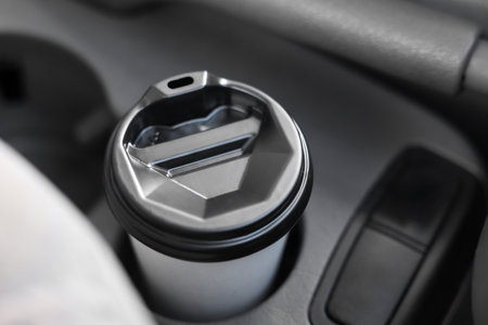 Coffee to go. Paper cup with tasty drink in holder inside of car, closeup