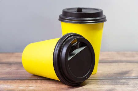 Barista serves coffee to the client. Hands Paper cup Bar counter Cappuccino Plastic cap. Coffee Business Concept