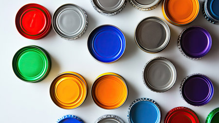 Recycling theme with a mix of plastic bottle caps and tin cans on a smooth surface, symbolizing environmental awareness.