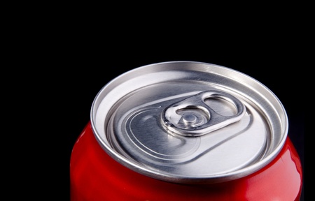 Red aluminium can typical of soda or beer can isolated on black