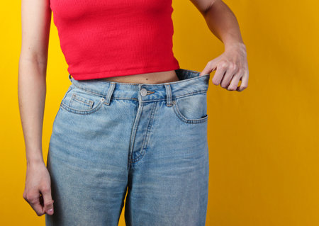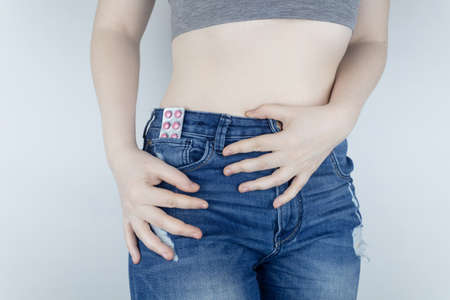Close up of a woman midsection struggling with tight blue jeans, highlighting belly fat and discomfort from weight gain.
