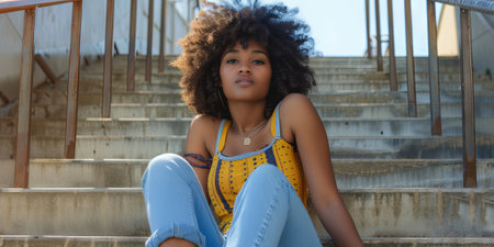 Beautiful african american woman with afro hairstyle posing at stairs.