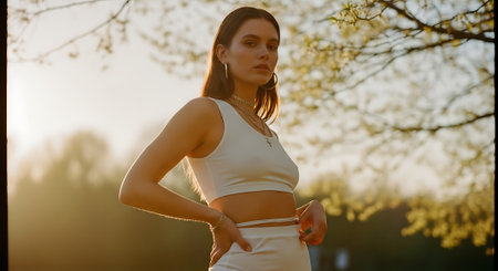 Beautiful young woman in sportswear in the park at sunset