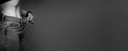 Female body before and after weight loss, diet concept. Woman is measuring waist. Belly and legs in jeans close-up.