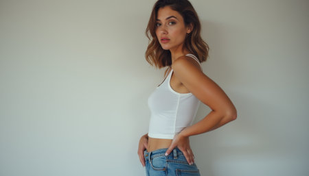 A stylish woman with wavy hair poses confidently against a minimalist background, showcasing her trendy outfit. Her expression exudes self-assurance and elegance, making this image perfect for fashion and lifestyle themes.