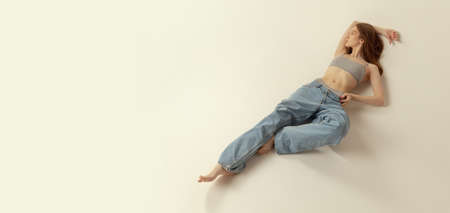 Portrait of young red-haired girl posing, lying on floor in top and oversized jeans isolated over grey studio background