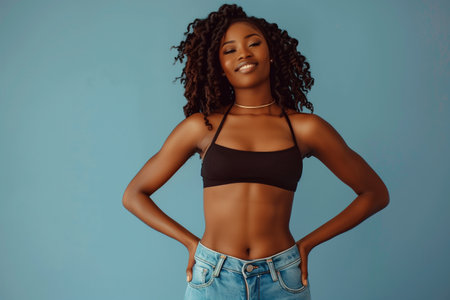 Slim female torso with toned abdomen wearing casual crop top and denim jeans, hands in pockets, fitness and healthy lifestyle concept