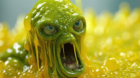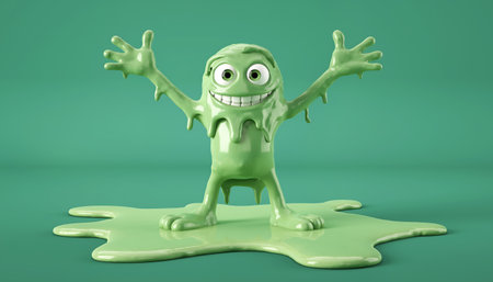 A playful green slime character grinning widely oozing with a glossy texture creates a lighthearted atmosphere in any setting.
