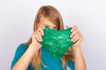 Cute young girl playing with green slime looks like gunk