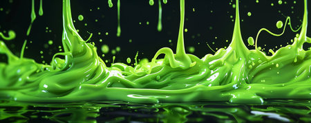 Vibrant green liquid splashes with abstract droplets on a dark background, dynamic and energetic concept