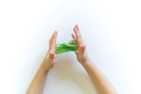 Hand in the slime. A boy plays a green slime. The child holds a slime.