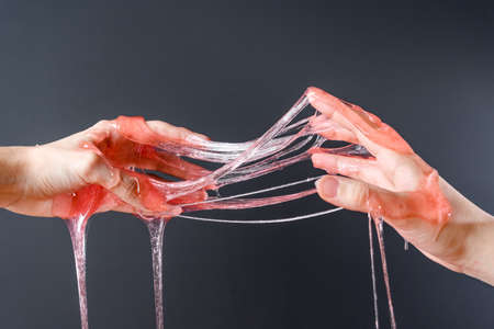Pink anti stress toy slime in hand. Fighting anxiety and stress. Creative game experiment for children.