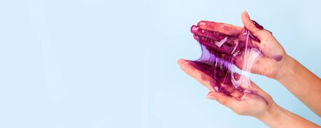 Young girl hands with sticky purple slime on blue background, liqiud wax for depilation, conceptual flyer banner with copy space, antistress relax, modern kids hobby