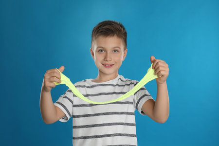 Little boy with slime on blue background