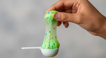 A hand stretches a piece of bright green, gooey slime filled with colorful microbeads and glitter. The fun, sensory toy is being lifted out of a small white spoon against a plain background, highlighting its texture and playful nature.