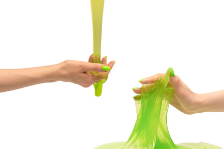 Person taking homemade green slime from hand of friend and pulling it up