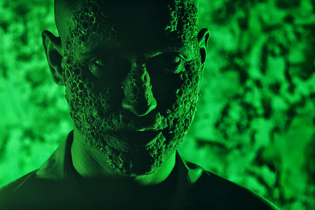 A close up portrait of a sick scientist after a failed experiment in the green light. desperation, hopelessness. Horror, halloween.