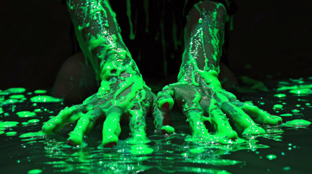 A persons hands covered in green slime with a black background, AI